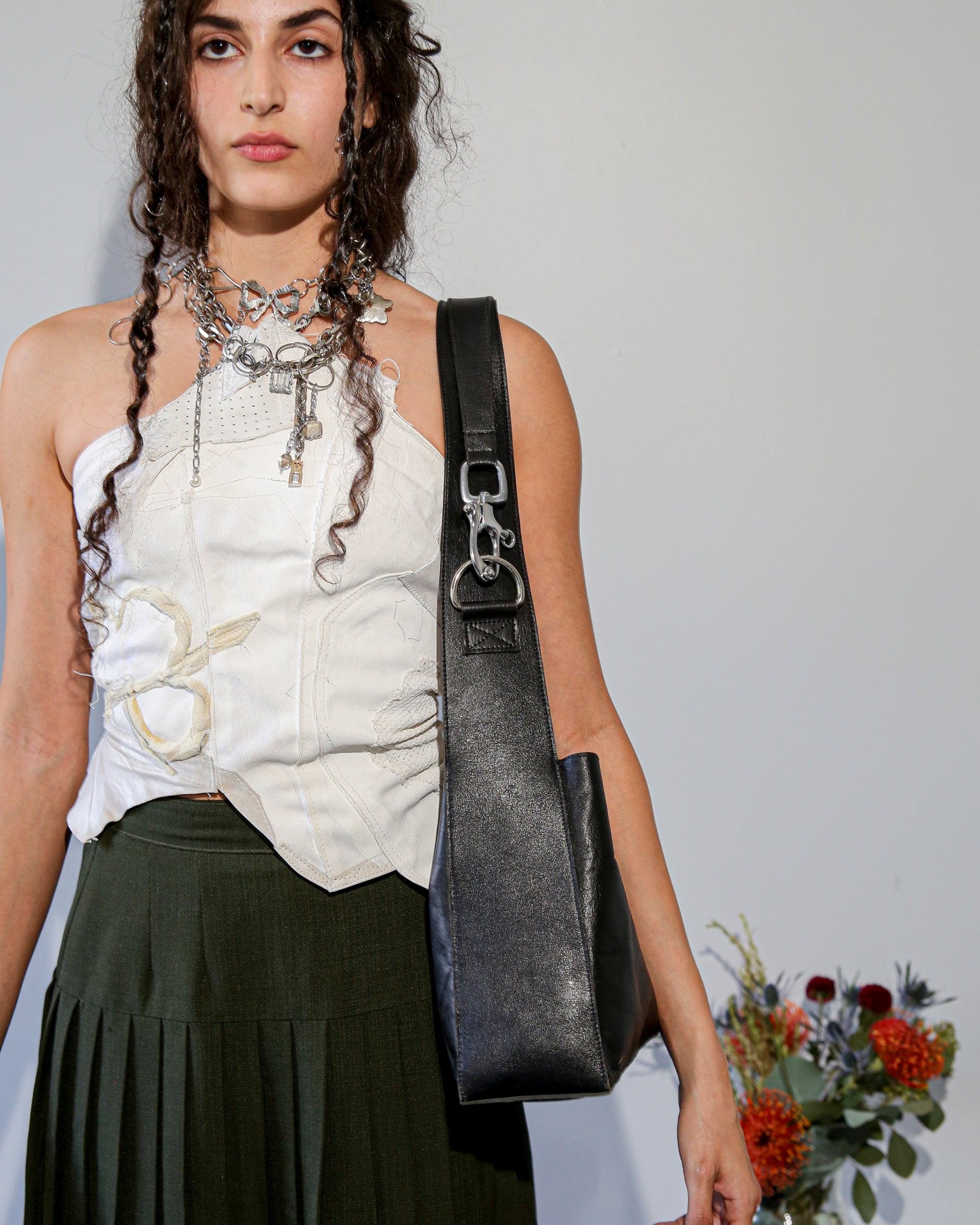 One of one made from cowhide with industrial lobster clasp hardware. Bag is fully adjustable from crossbody to shoulder and can be worn at four different lengths.