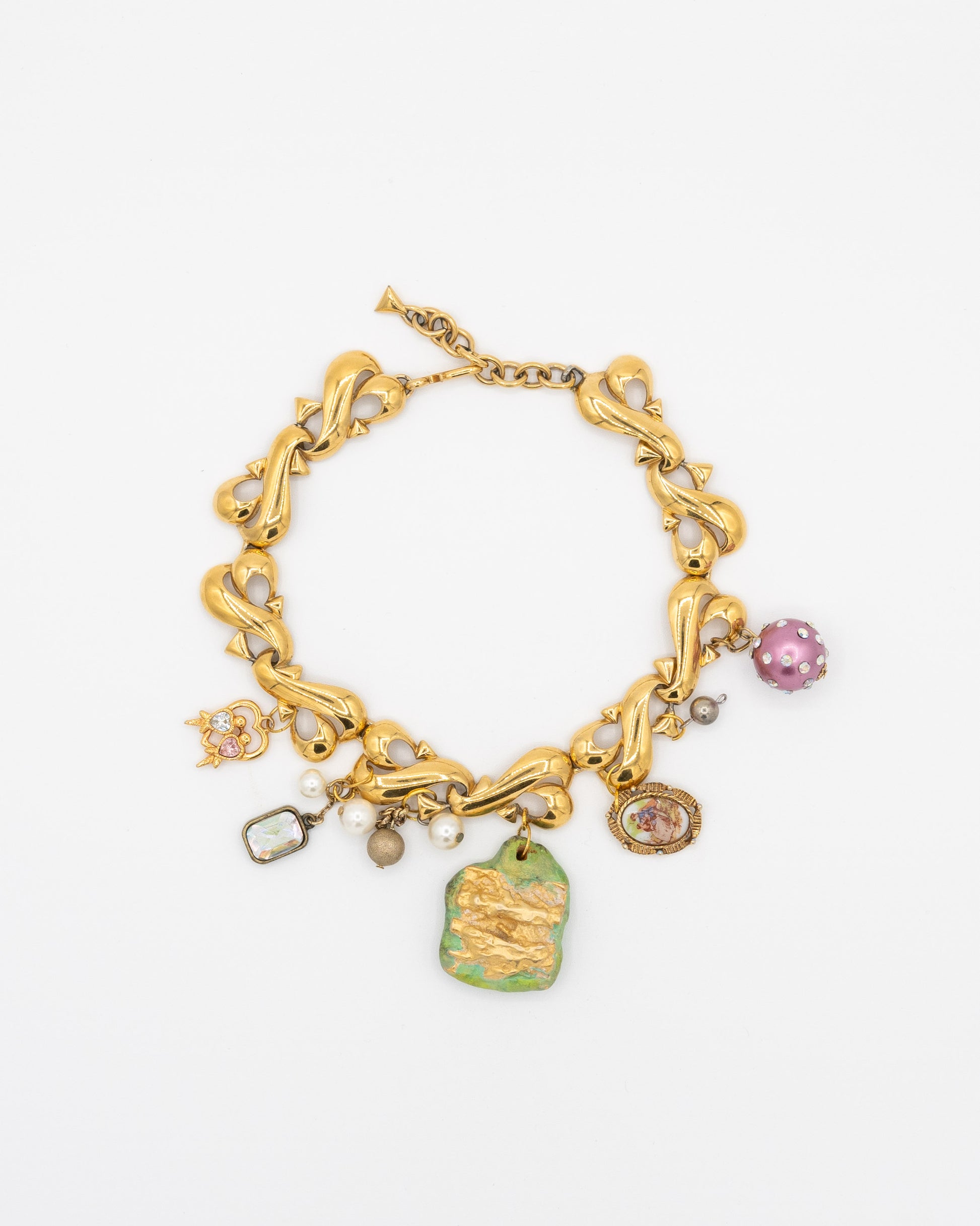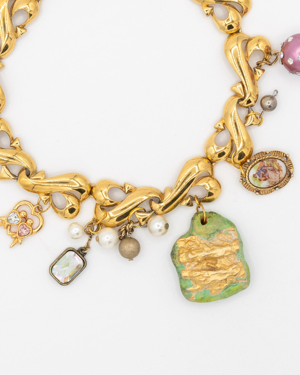One of one made from collected chain and charms. Center charm is an up cycled vintage button, clay molded, painted and sealed.