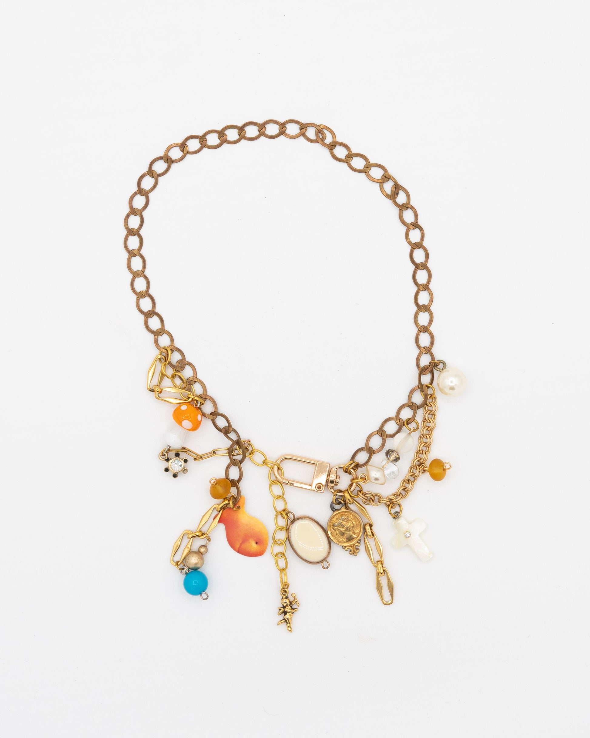 One of one made from collected chain and charms. Necklace clasps in front.