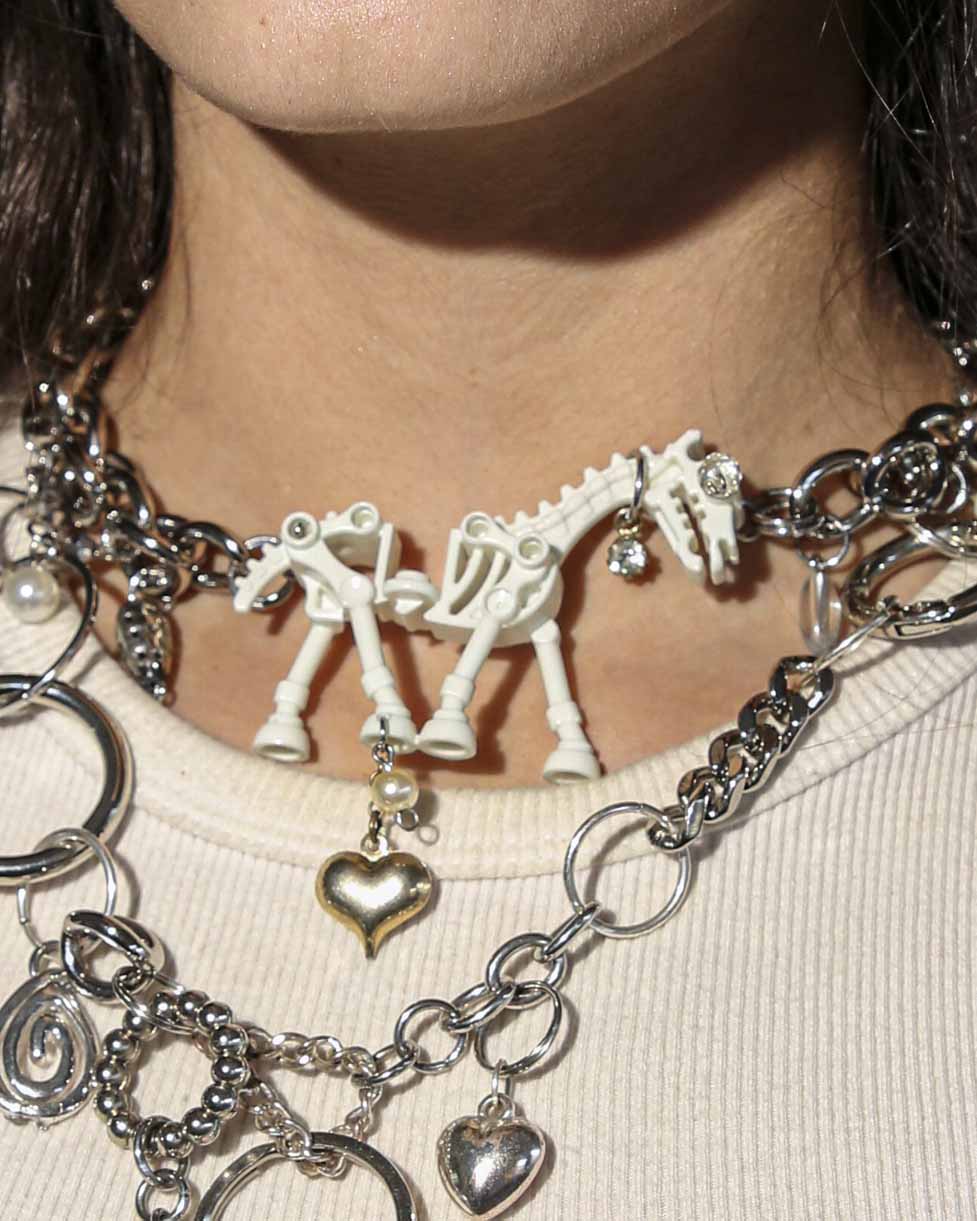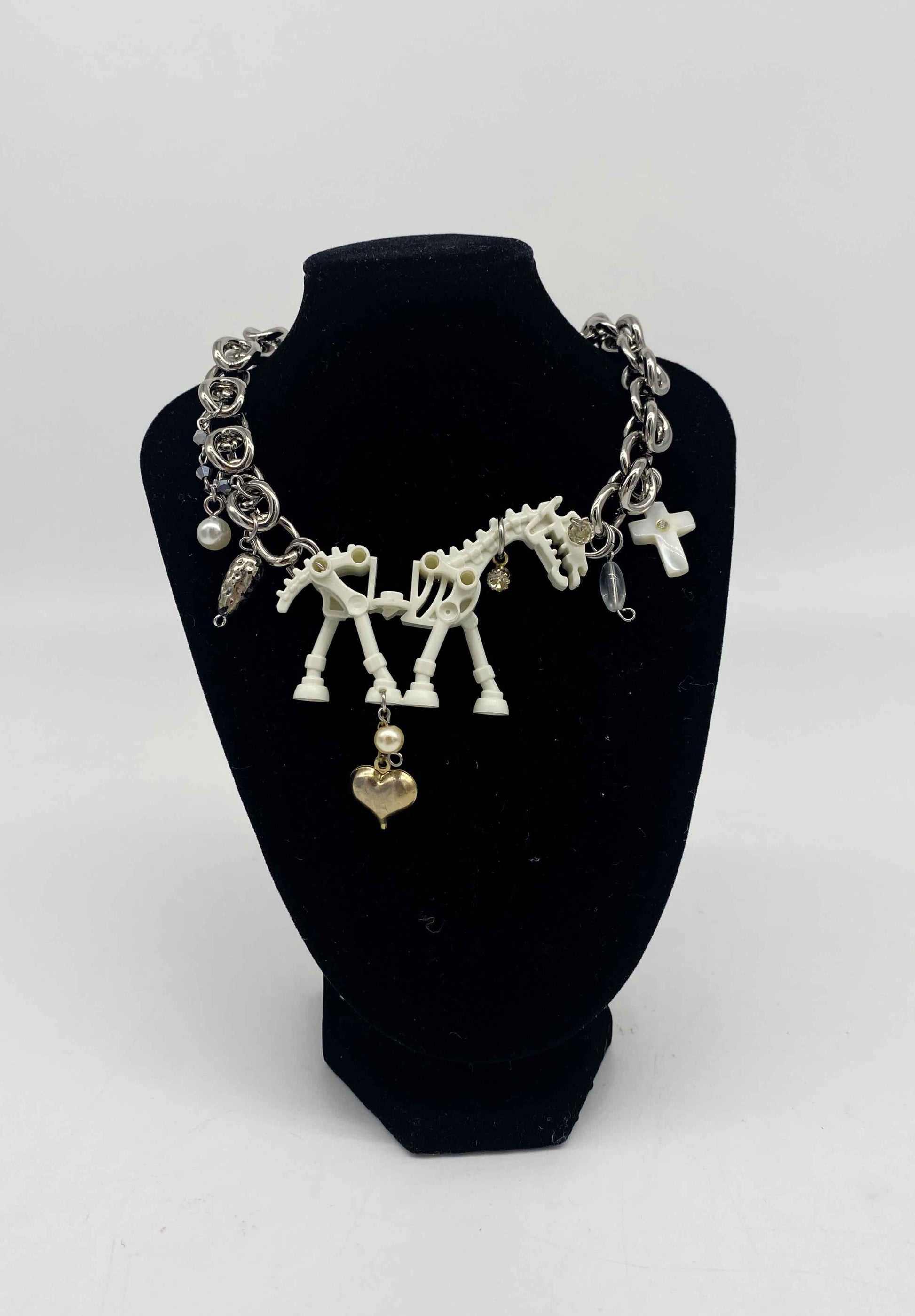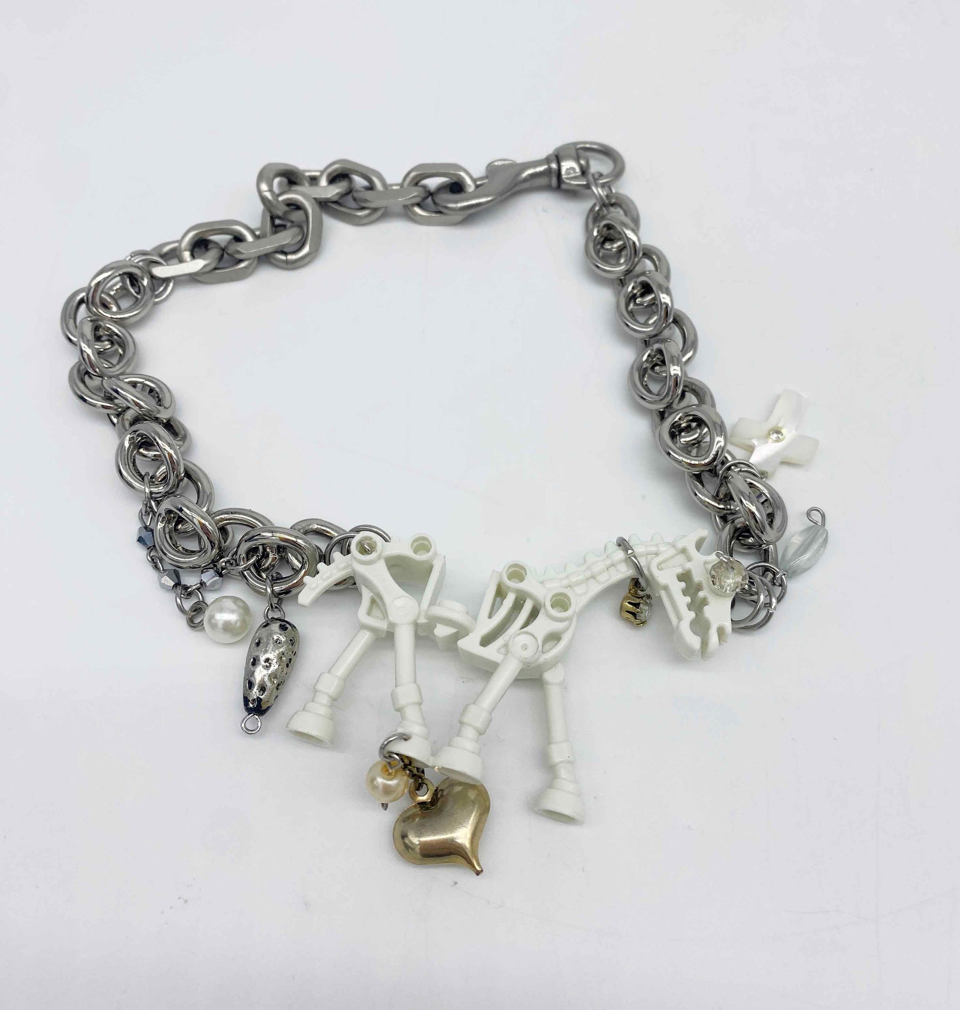 One of one made from collected silver chain and charms. Center charm is a leggo skeleton horse. Length is fully adjustable: