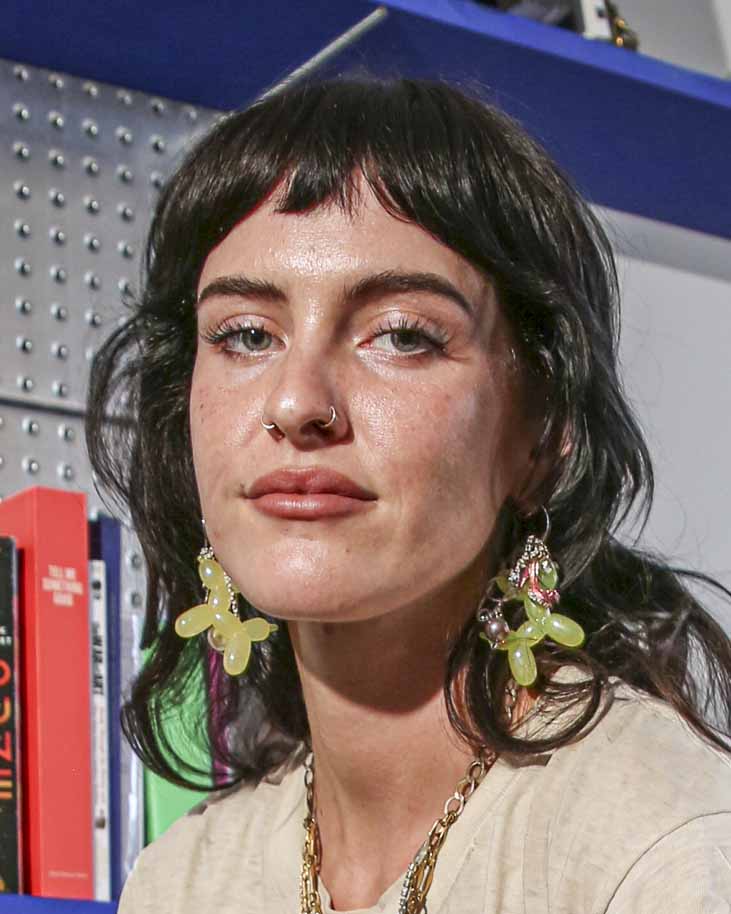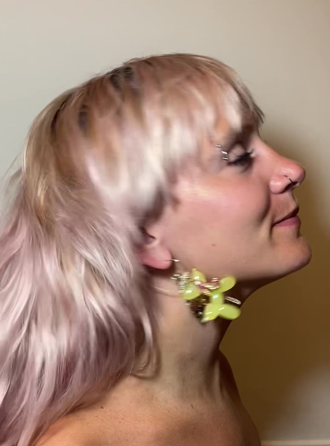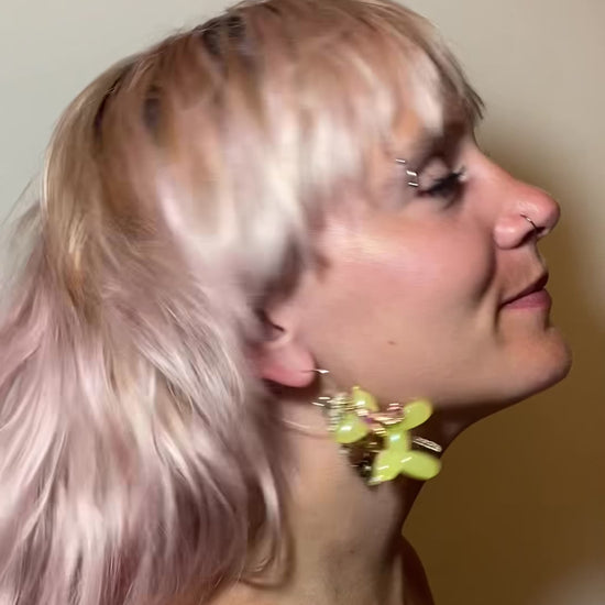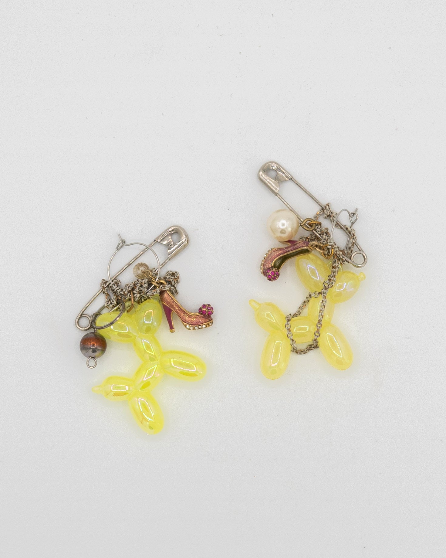 Jeff Koons inspired earrings made with collected charms, chain, pearls and safety pins attached to a silver hoop.