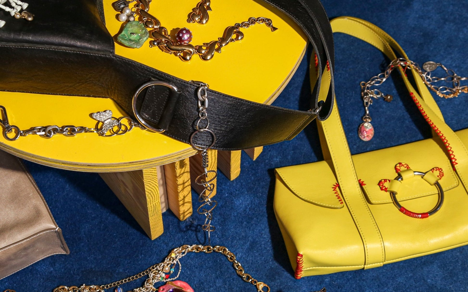 One of one neon cowhide and pig suede interior with interior back wall packet. Hand embroidered with red embroidery floss.