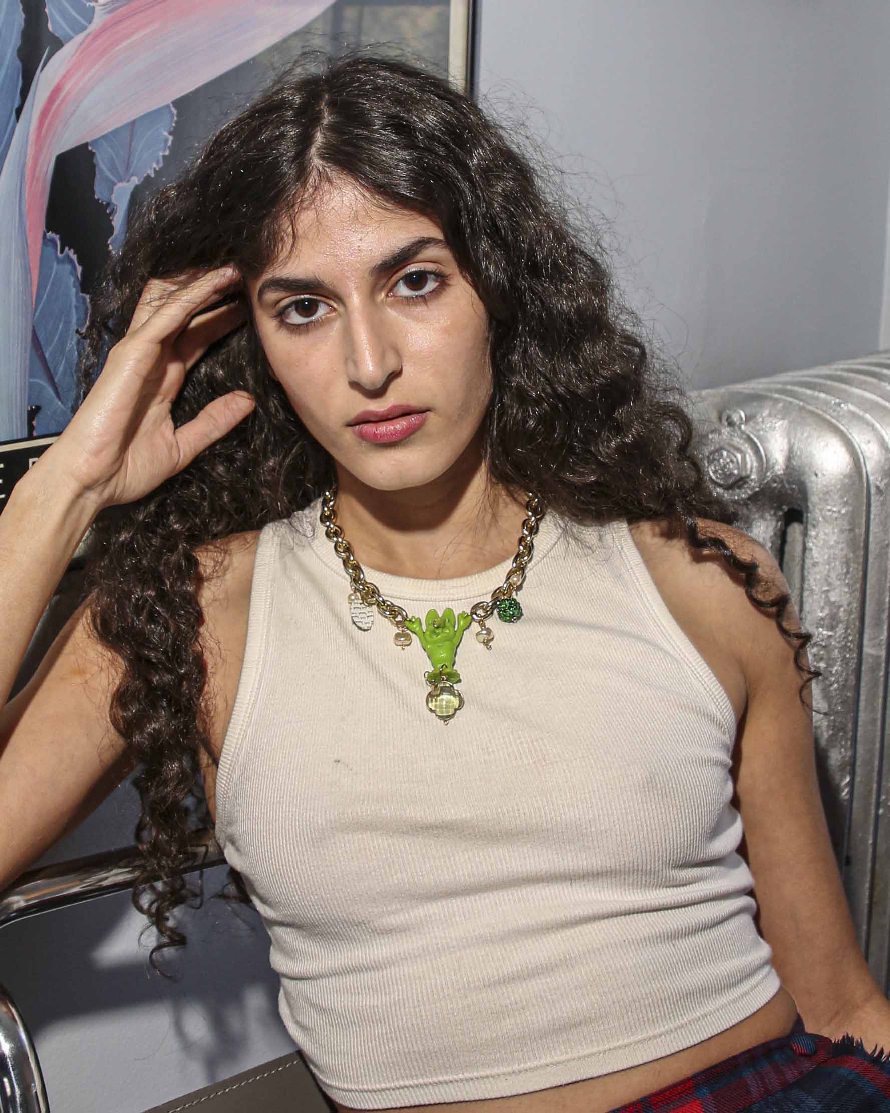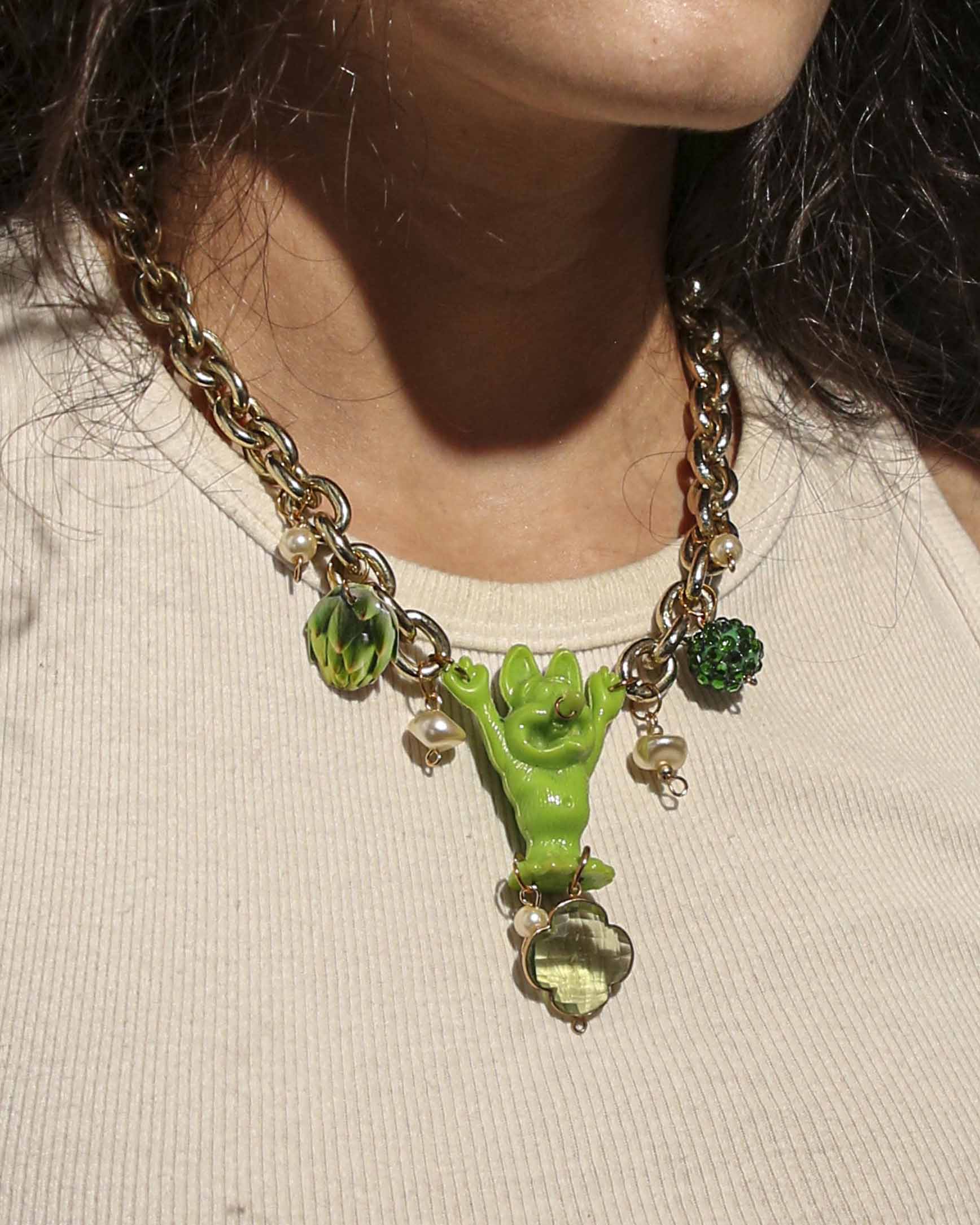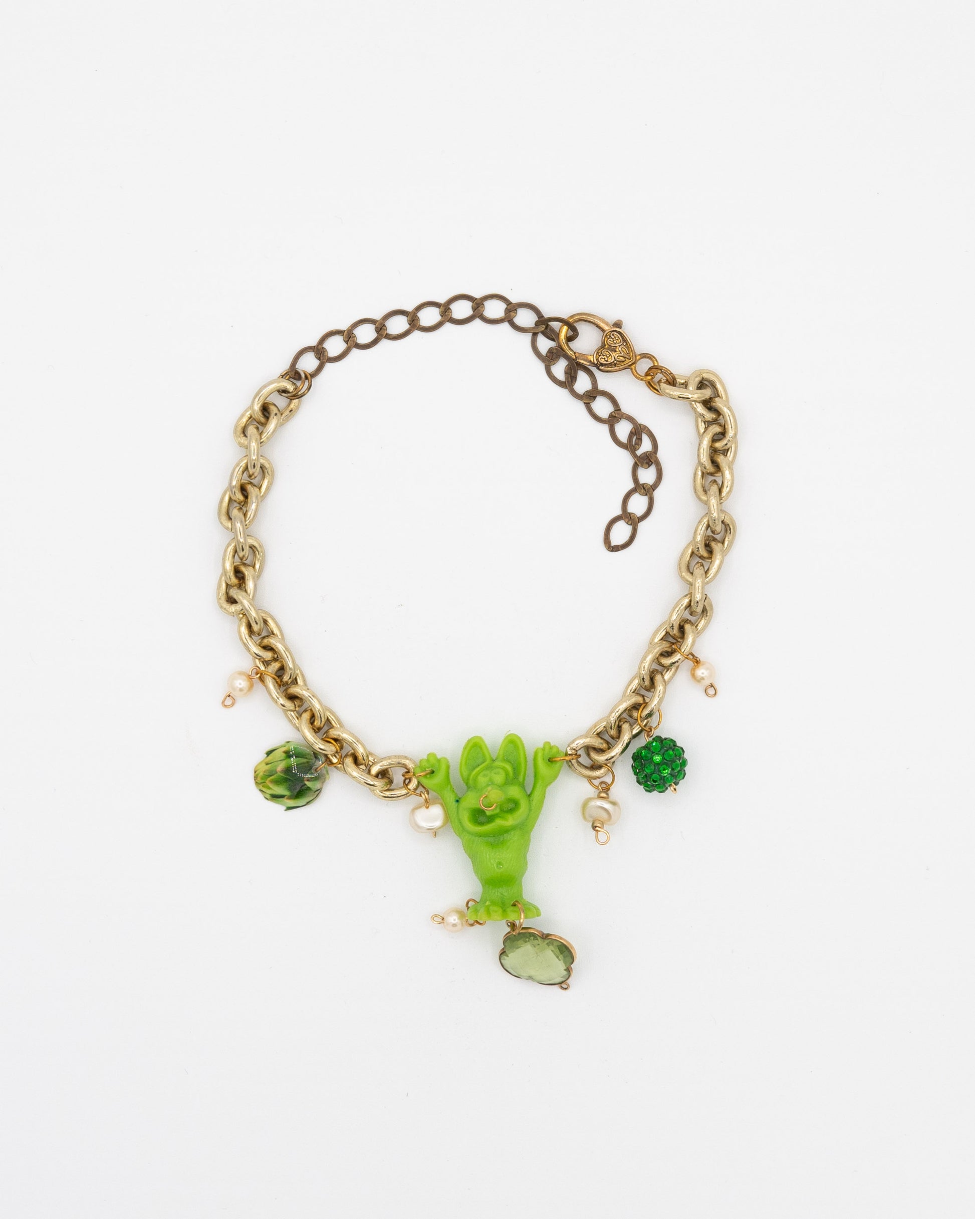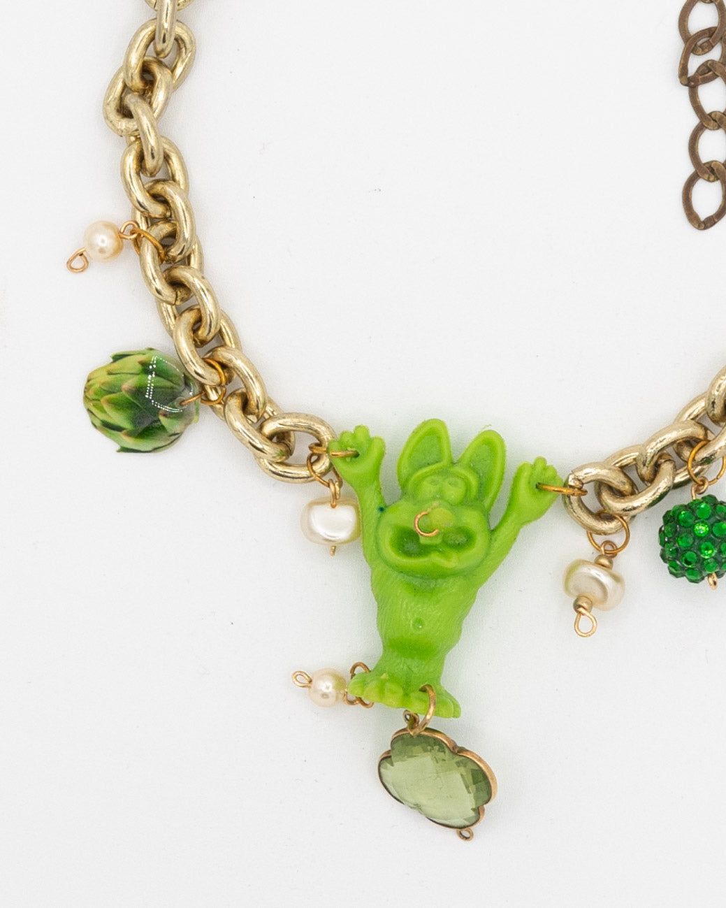 Collected chain, charms, and rat fink plastic toy. Adjustable length: