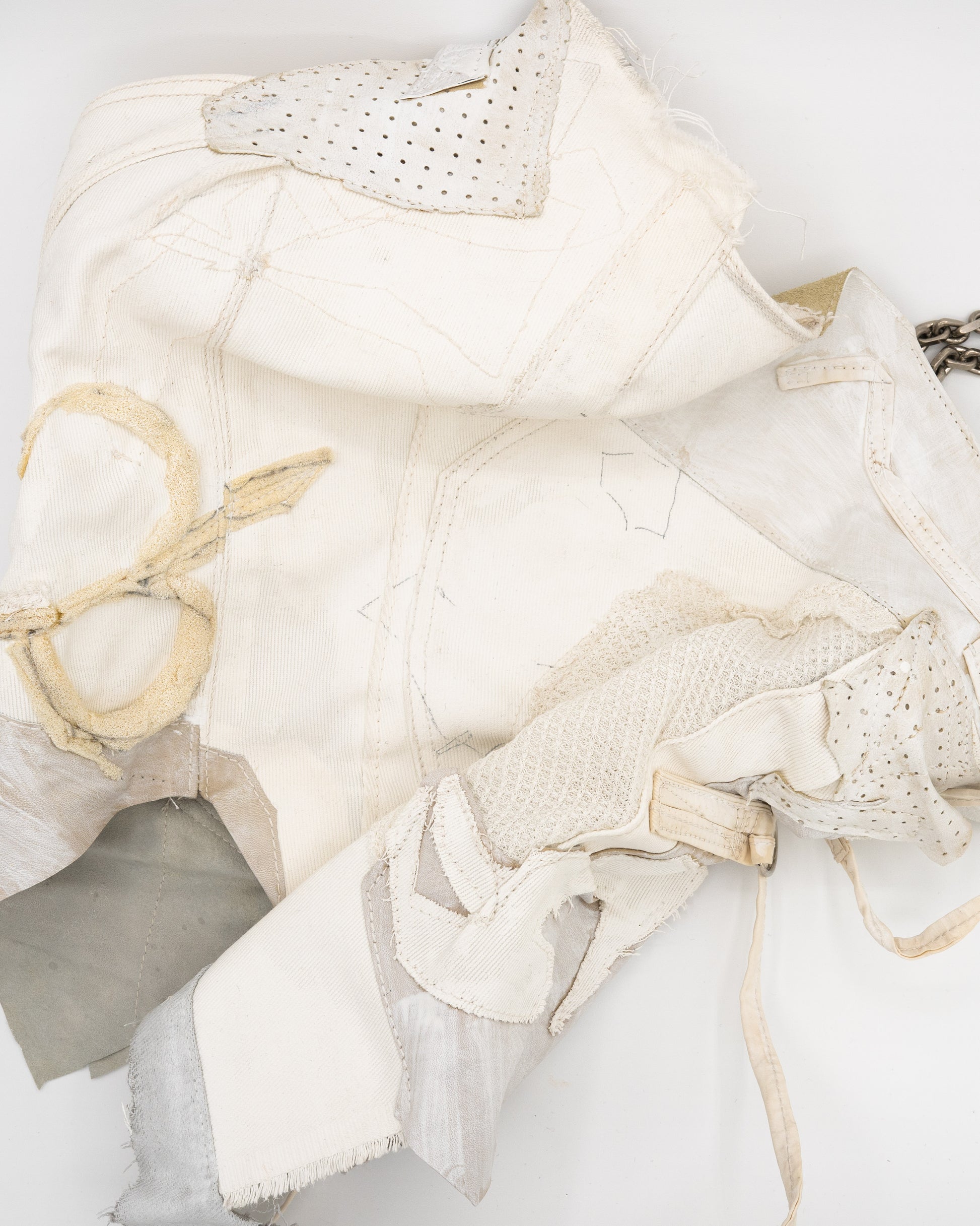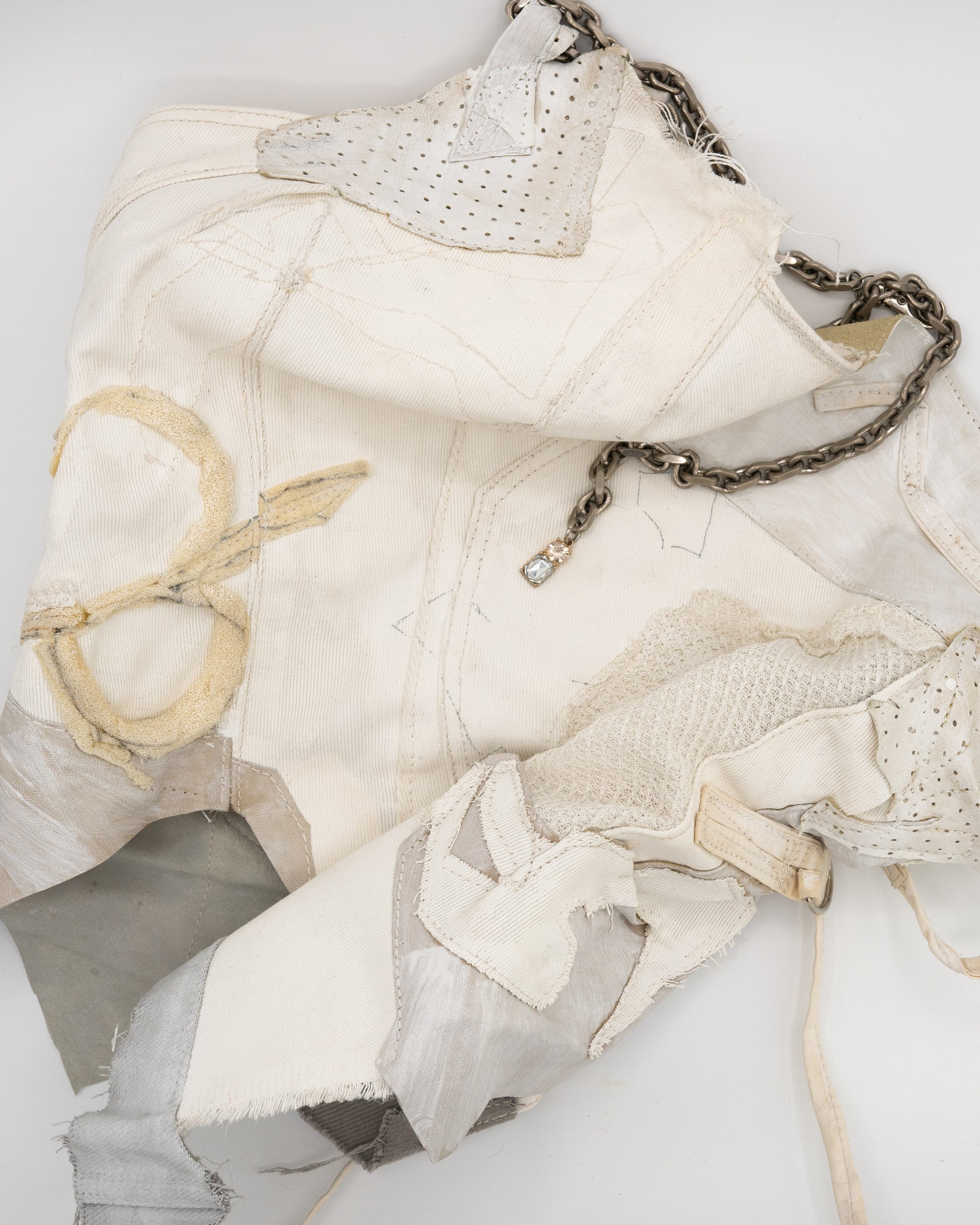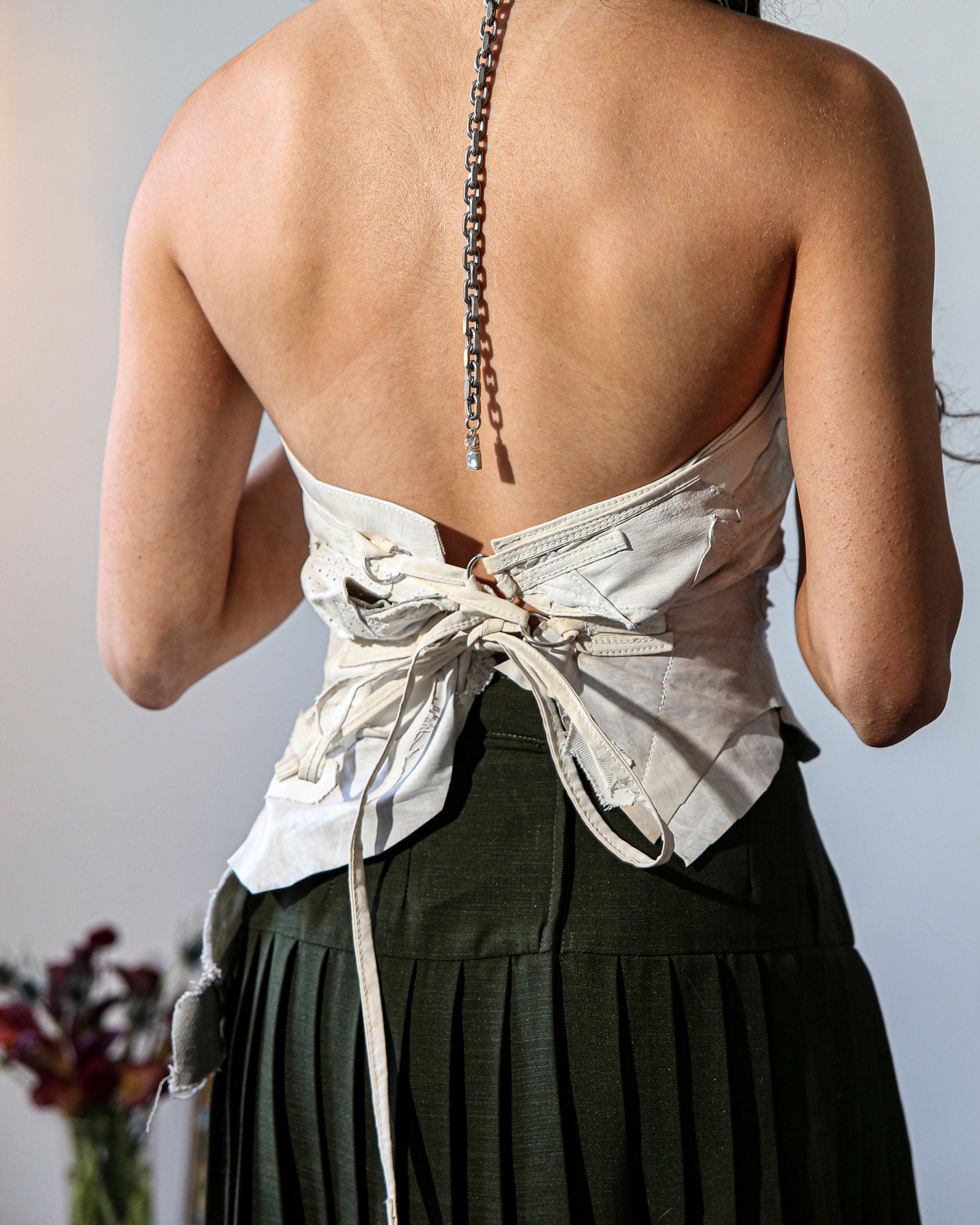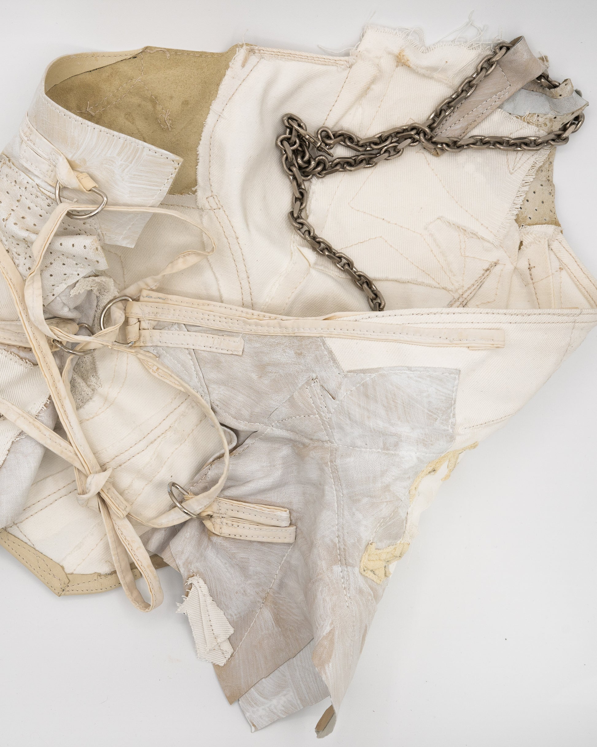 Material scrap corset top. Made from pieced together leather, fabric, foam, and nylon with a white wash finish. D-ring tie back and adjustable chain halter. Chain is removable and can be worn on its own.