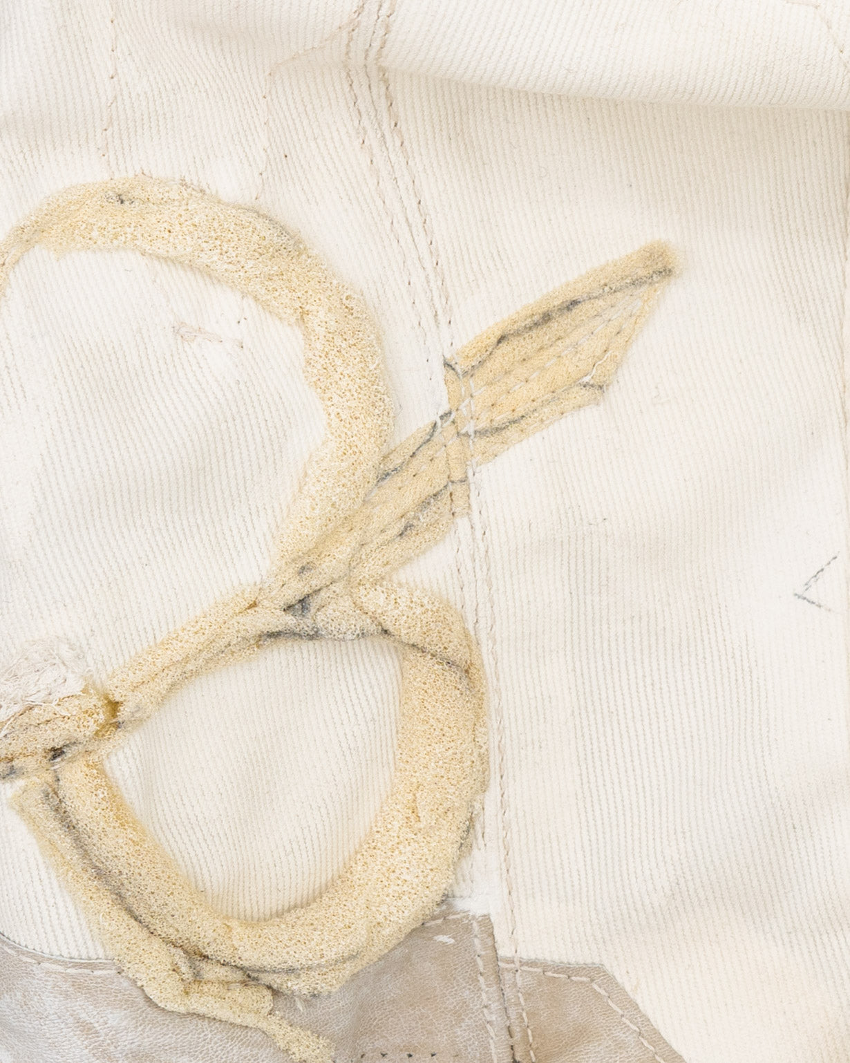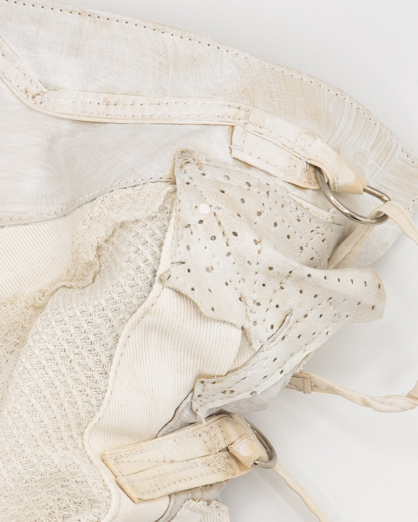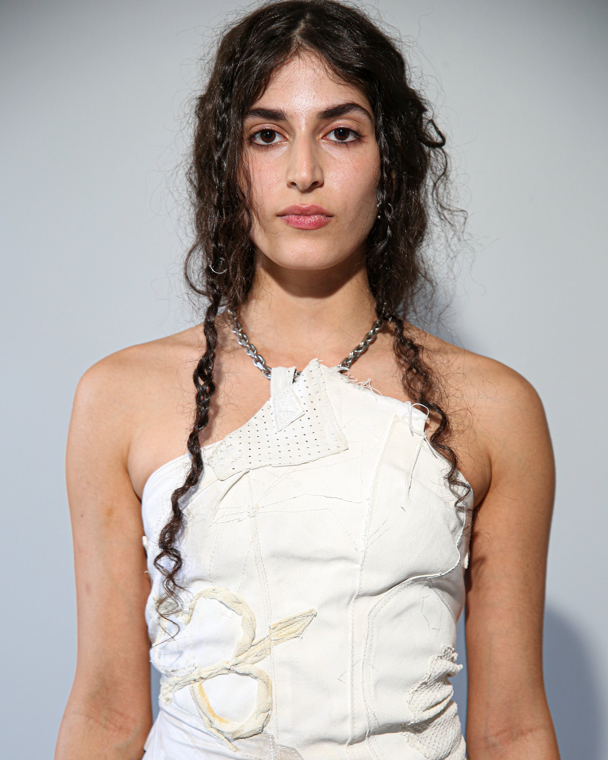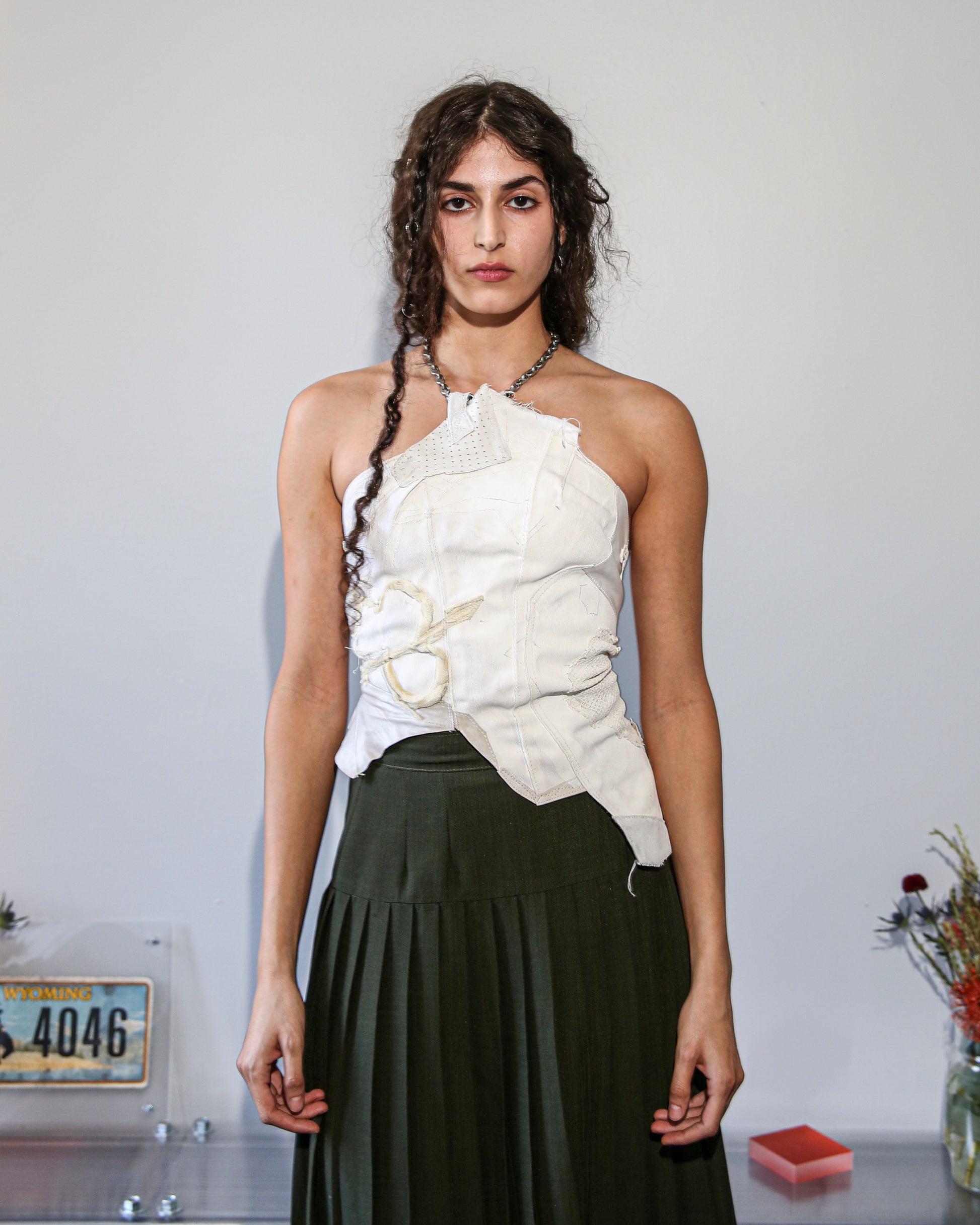 Material scrap corset top. Made from pieced together leather, fabric, foam, and nylon with a white wash finish. D-ring tie back and adjustable chain halter. Chain is removable and can be worn on its own.