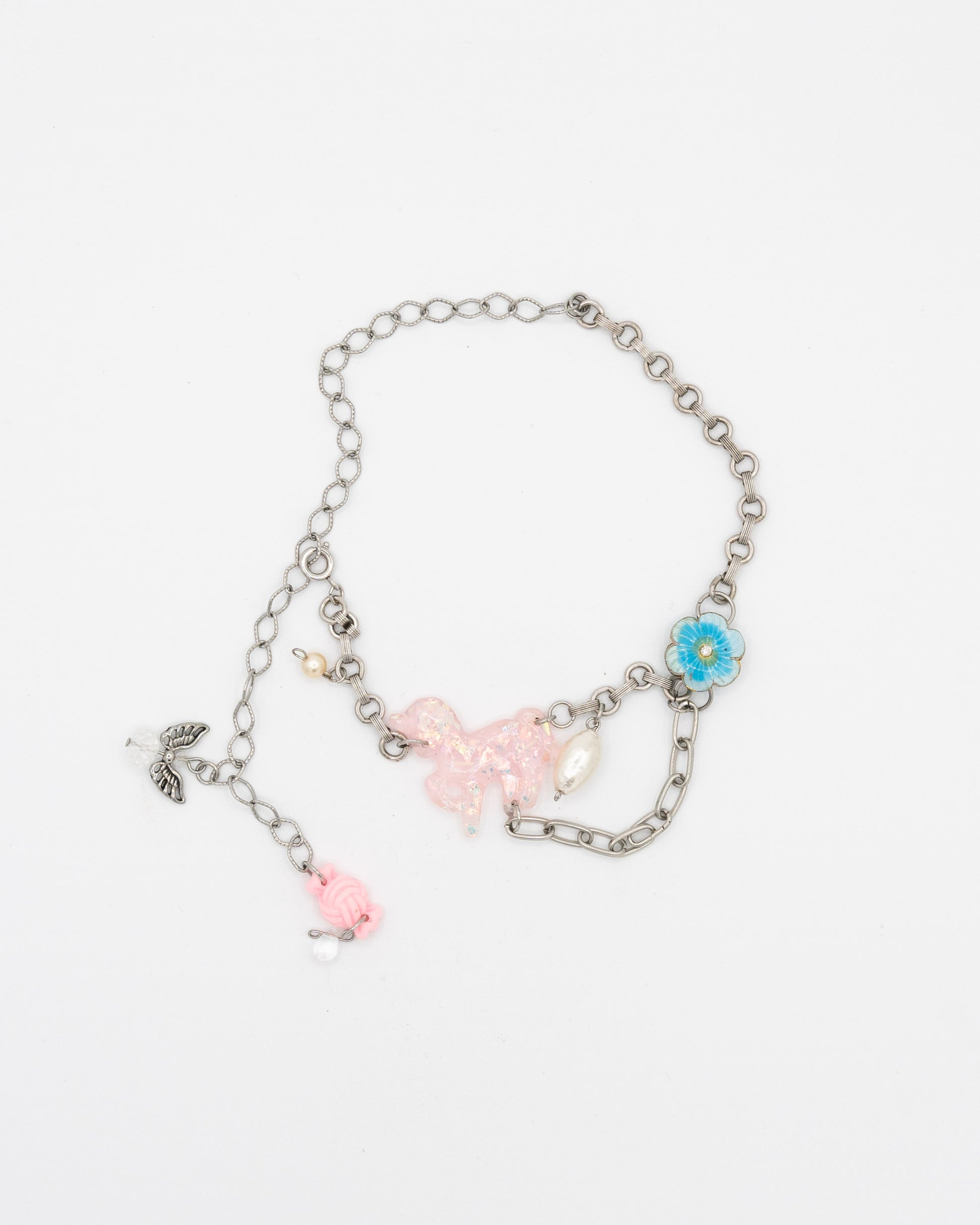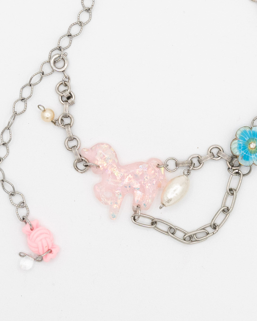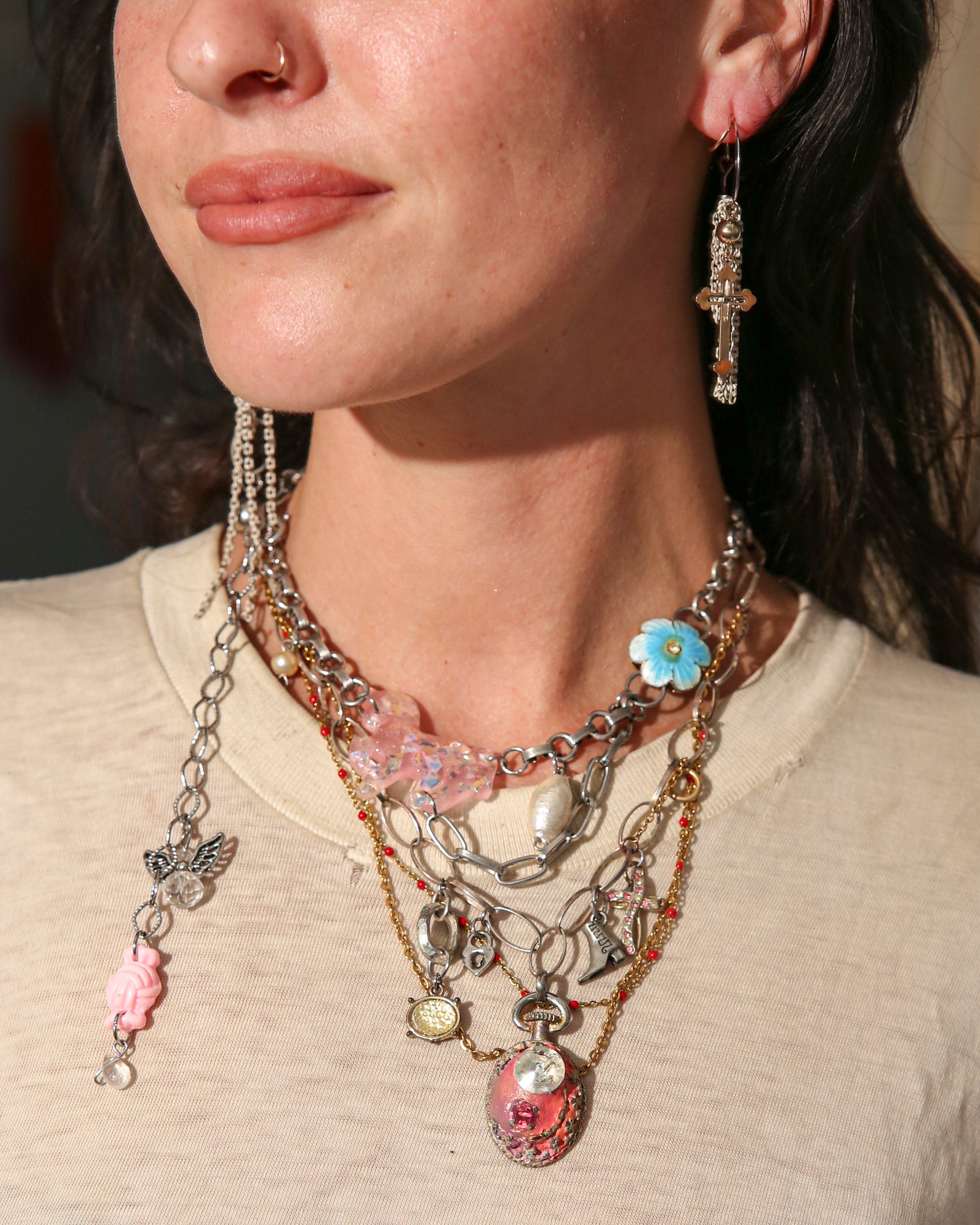 One of one collected silver chain and charms. Clasps at side, length is fully adjustable: