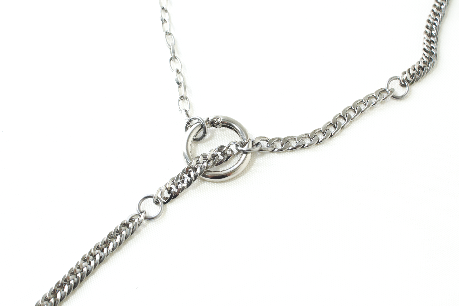 One of one chain made from collected stainless steel chain and circular carabiner. Necklace is fully adjustable between jump rings and can be worn with the clasp in the front or back.