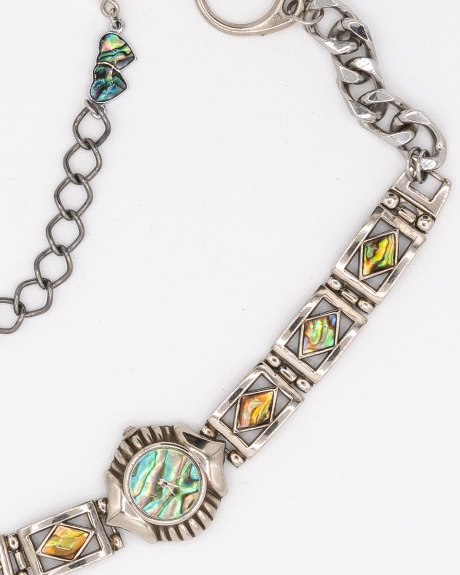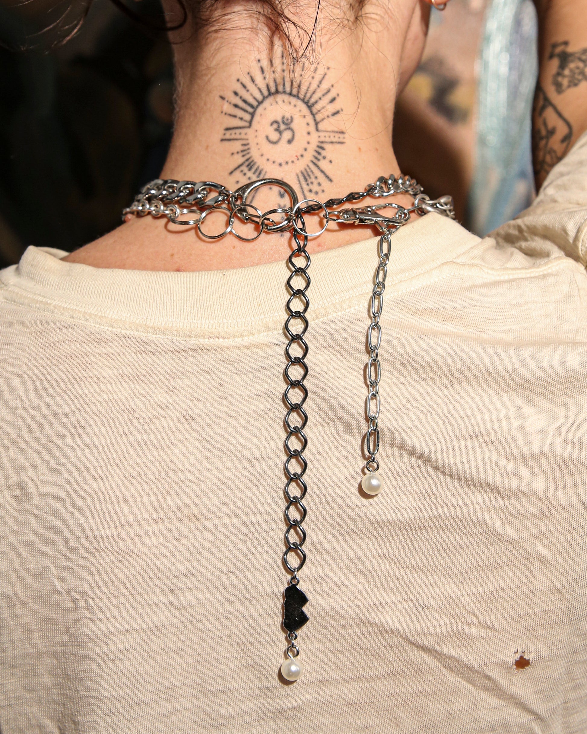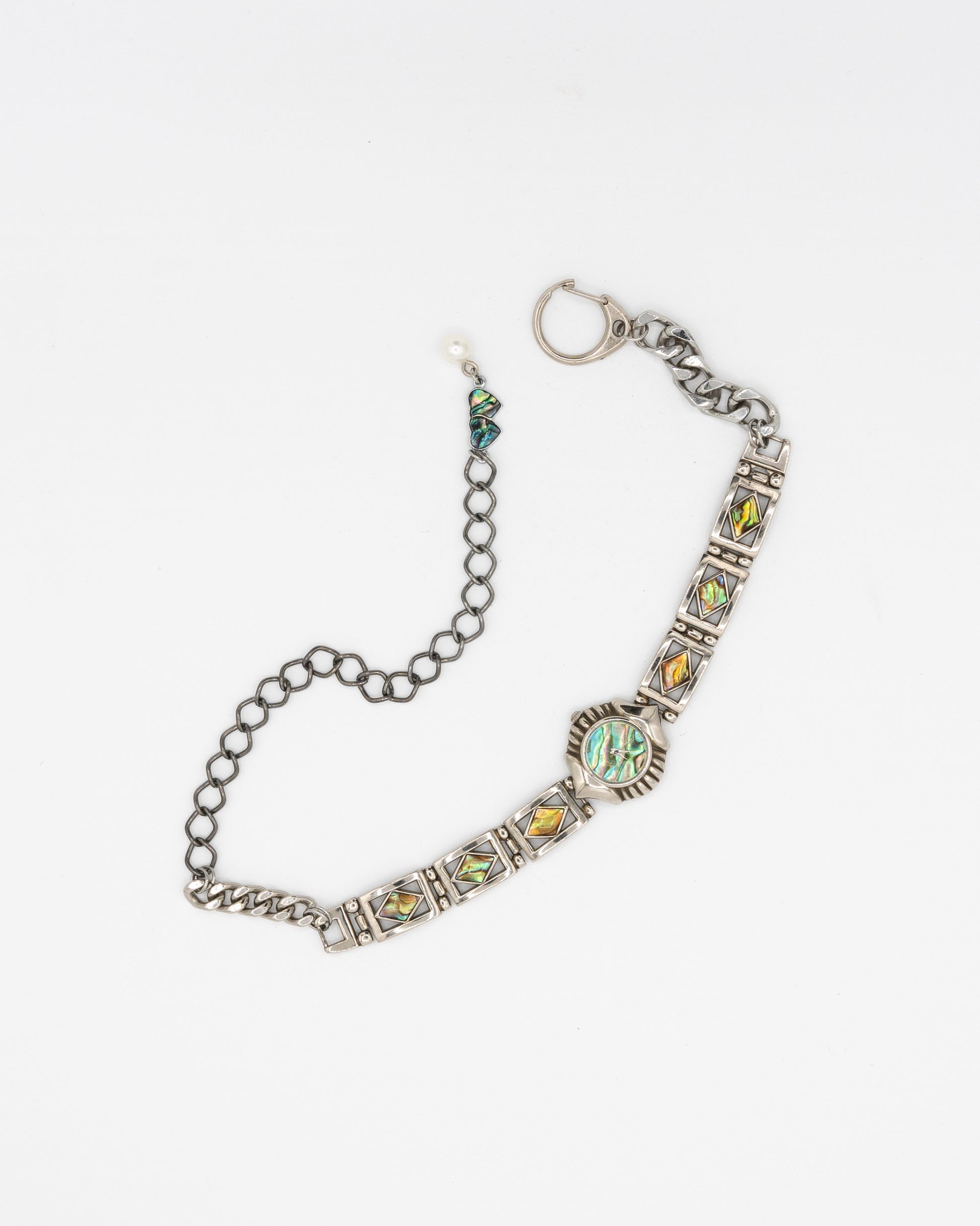 One of one made from vintage watch and collected chain. Meant to be worn as a choker, chain falls down the back of the neck when clasped.