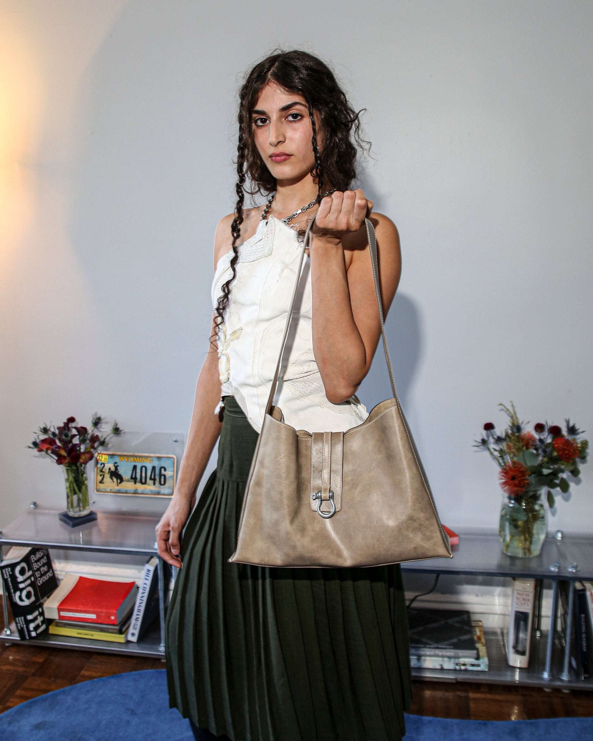 One of one neutral gray shoulder with magnet closure. Bag is made from a waxed gray cowhide and a pig suede interior. Waxed leather is easily adaptable to wear and overtime will provide a naturally distressed and lived-in look.